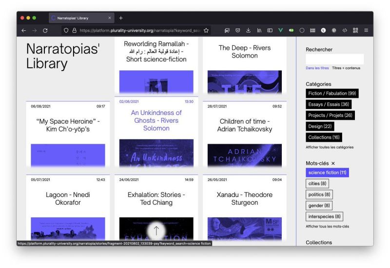 Corpora Fragments is a collaborative and open online tool around thematic explorations turned towards the future. This platform is used to collect references and share them with whomever is interested in browsing through them, using them for workshops, information, meetings… It is a great way to plunge into the speculative futures, arts and fiction surrounding a specific theme and coming from a plurality of voices.