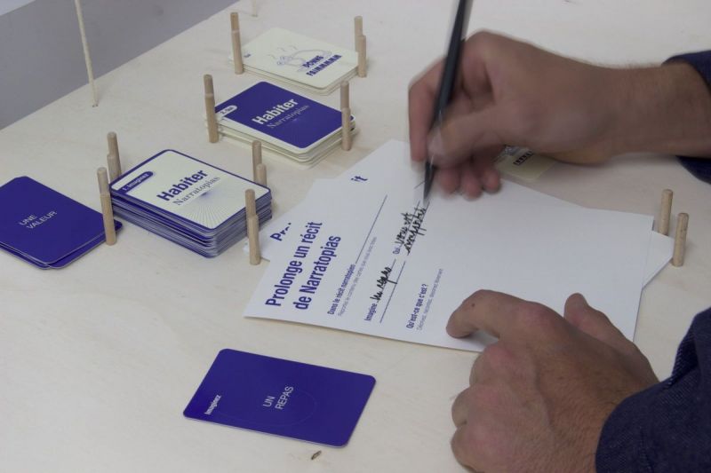 Based on Narratopia’s Library of Transformative Narratives, we have designed two devices whose role is to allow visitors of an exhibition, or participants in a workshop, to engage with narratives, discuss them, continue them and project themselves into the futures that they describe: the Narratopias Wall, and the Game.